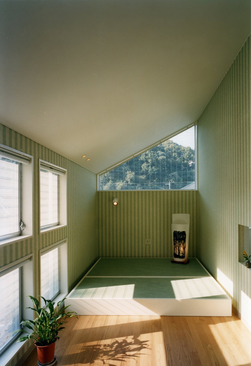 この敷地は南面が高い崖状であり、直接光を取り込むことが難しく、屋根を通して天井面より光を取り入れる吹き抜け案がイメージされました。 住まい方もシンプルに、設計もシンプルに、外回りも極シンプルに、イメージカラーのグリーンの床は蓄熱タイプの床暖房でヌクヌク 吹抜空間の「ぎゃらりー」と「寝どこ」をつなぐ「ぶりっじ」 ここへは拡がりと軽快性の「メッシュ階段」で昇る なんとも心地良い空間に仕上がりました。
